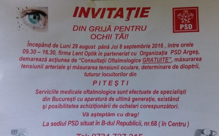 Blocurile din Pitești au fost împânzite zilele acestea cu afișe care anunțau începerea unei campanii de consultații oftalmologice gratuite la sediul… PSD Argeș! Afișul îl puteți vedea în poza alăturată și nu e prima oară când social-democrații colaborează cu astfel de firme pentru a da bine în ochii alegătorilor. Firma respectivă își oferă serviciile până […]