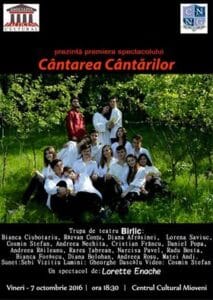 Vineri, 7 octombrie 2016, ora 18.30, după festivitatea de deschidere a Festivalului Național de Teatru Ludicus, va avea loc spectacolul ,,Cântarea Cântărilor”. Este un poem închinat iubirii profunde și înălțătoare, transpus scenic prin limbaj corporal, dar şi împletind cuvântul cu vibraţia trupului. Trupa de teatru ”Birlic” vă invită la un spectacol dinamic şi sensibil totodată, […]