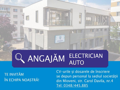 Servicii Edilitare pentru Comunitate Mioveni SRL scoate la concurs în vederea angajării pentru Sectorul COLOANA AUTO, 1 post de ELECTRICIAN AUTO Cerințe: studii medii – liceal/școala profesională de specialitate; curs calificare electrician auto; 3 ani experiență în specialitatea electrician auto. CV-urile și dosarele de înscriere se depun personal la sediul societății din Mioveni, str. Carol […]