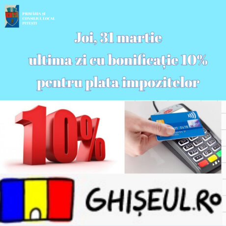 Direcția de Impozite și Taxe Locale Pitești reamintește cetățenilor că joi, 31 martie 2022, este ultima zi în care plata impozitelor aferente anului fiscal 2022 se poate face beneficiind de bonificația de 10 % din valoarea acestora. Este recomandată alternativa plăţii online a impozitelor şi taxelor locale, precum și a amenzilor contravenționale, variantă rapidă, […]