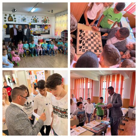 Primarul Cristian Gentea și inspectorul general Dumitru Tudosoiu, în mijlocul copiilor de la Școala Gimnazială Traian