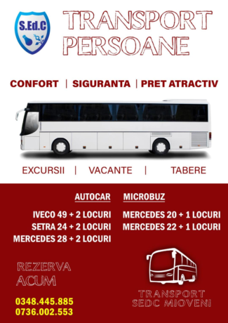 Servicii Edilitare pentru Comunitate Mioveni pune la dispoziție, contra cost, mijloace de transport pentru efectuarea de curse intern și internațional. „Climatronic, cu minibar, frigider, scaune confort, având personal cu vastă experiență în transport, autocarele si microbuzele noastre vă asigură un nivel ridicat de confort și siguranță. În funcție de numărul de kilometri și de durata […]