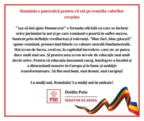 Să nu uităm vreodată că țara noastră e România, că ne-am născut și vom muri români. La mulți ani, România! La mulți ani, Priboieni! La mulți ani tuturor românilor! Primar Sorin Lupu