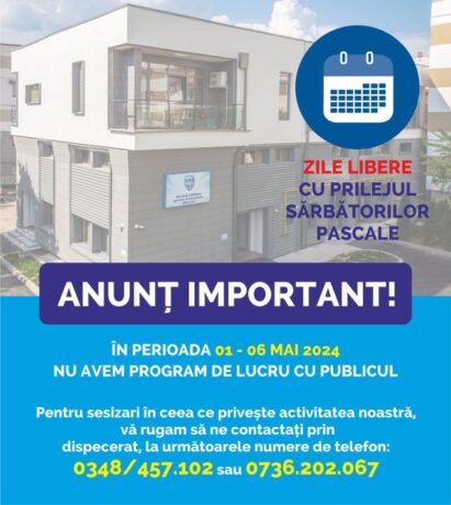 În perioada 01 – 06 mai 2024 societatea Servicii Edilitare pentru Comunitate Mioveni SRL Mioveni nu desfășoară program de lucru cu publicul. – Ziua de miercuri, 01 mai (Ziua Muncii) este #zi #liberă legală, iar suplimentar, s-a decis ca și ziua de 02 mai, sa fie liberă, pentru a se face punte cu Paștele (3 […]
