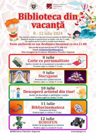 # Dragi copii, sunteți așteptați și în perioada vacanței de vară la atelierele, cursurile și expozițiile organizate de instituțiile de cultură finanțate de Consiliul Județean Argeș! # Garantăm distracția, relaxarea dar și creativitatea și dezvoltarea laturii artistice! # Porțile Muzeului Golești, Muzeului Județean și Bibliotecii Județene sunt deschise pentru voi! Iată programul complet al activităților […]