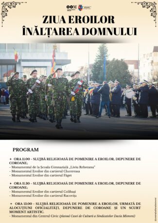Centrul Cultural, Primăria Orașului și Consiliul Local Mioveni vă invită să participați la manifestările dedicate Zilei Eroilor, prilej de cinstire a memoriei celor care s-au jertfit pentru patrie, libertate și credință. PROGRAMUL EVENIMENTULUI: Ora 11:00 – Slujbă religioasă de pomenire a Eroilor și depunere de coroane: – Monumentul de la Școala Gimnazială „Liviu Rebreanu” – […]