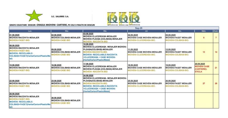 Mioveni: Programul de colectare a deșeurilor reciclabile pentru luna SEPTEMBRIE 2025 Primăria Orașului Mioveni a anunțat astăzi programul de colectare a deșeurilor reciclabile pentru luna SEPTEMBRIE 2025. Astfel, pentru luna septembrie 2025, operatorul zonal va colecta deșeurile reciclabile, biodegradabile și reziduale de la populație, conform următorului program: