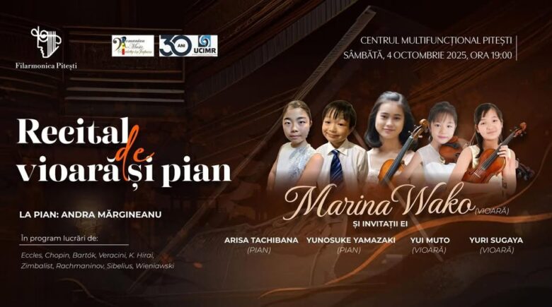 Recital de vioară și pian, la Filarmonica Pitești Filarmonica Pitești organizează sâmbătă, 4 octombrie, de la ora 19:00, la Centrul Multifuncțional, recitalul de pian și vioară susținut de violonista Marina Wako și invitatele sale: pianistele Arisa Tachibana și Yunosuke Yamazaki și violonistele Yui Muto și Yuri Sugaya. Acompaniază, la pian, Andra Mărgineanu În program, lucrări […]