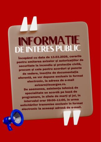 ISU Argeș: Informație de interes public ISU Argeș anunță că începând cu data de 13.03.2026, cererile pentru emiterea avizelor și autorizațiilor de securitate la incendiu și protecție civilă, precum și cele pentru acorduri și puncte de vedere, însoțite de documentația aferentă, se vor depune exclusiv în format electronic, la adresa de e-mail avizare@isuarges.ro. Documentațiile trebuie […]