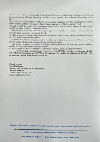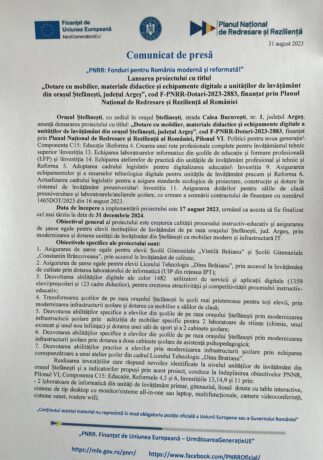 A fost lansat proiectul cu titlul „Dotare cu mobilier, materiale didactice și echipamente digitale a unităților de învățământ din orașul Ștefănești, județul Argeș”, cod F-PNRR-Dotari-2023-2883, finanțat prin Planul Național de Redresare și Reziliență al României