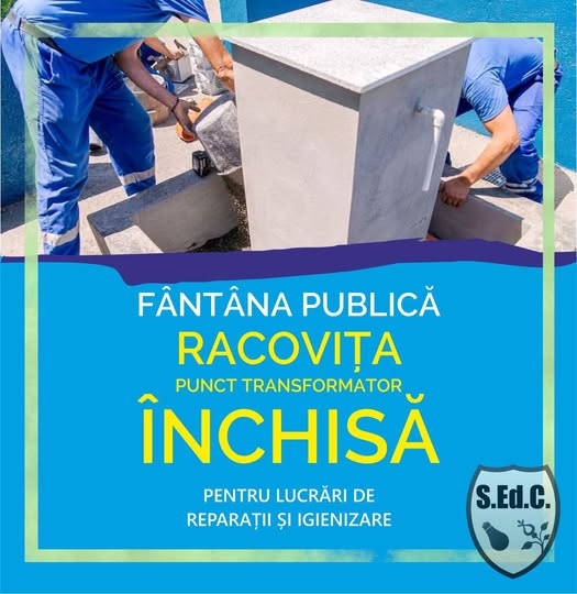 Servicii Edilitare pentru Comunitate Mioveni informează că, începând de astăzi, 27 iunie 2025, fântâna publică din Racovița – punct Transformator va fi temporar închisă, ca urmare a demarării unor lucrări de reparații și igienizare.