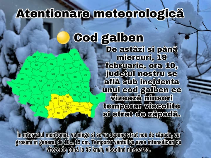 Până miercuri, 19 februarie, ora 10, județul nostru se află sub incidența unui cod galben ce vizează ninsori temporar viscolite și strat de zăpadă.