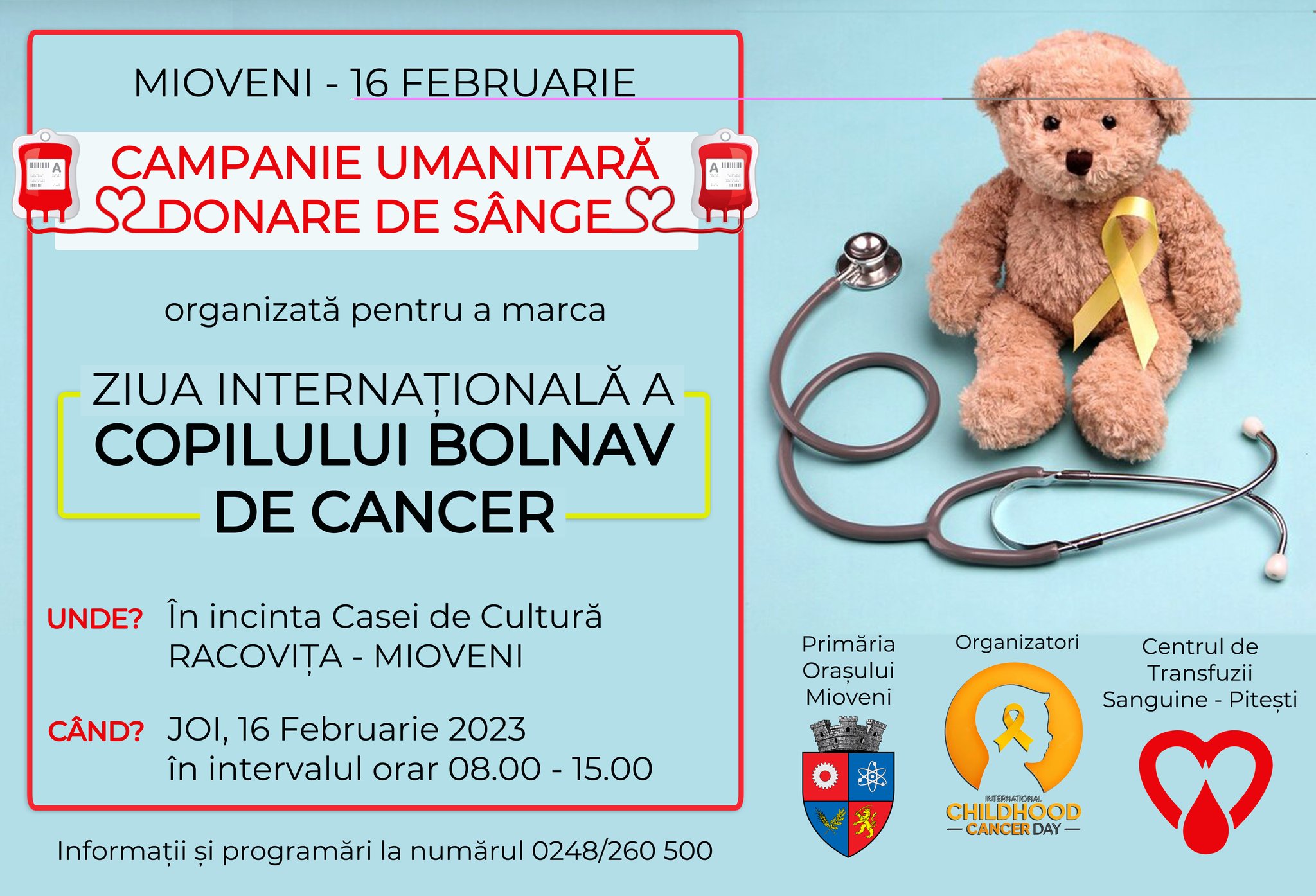 Pentru a marca într-un mod activ și eficient „Ziua Internaţională a Copilului Bolnav de Cancer”, Primăria orașului Mioveni în parteneriat cu Centrul de Transfuzii Sanguine Pitești organizează o campanie de donare de sânge, pe data de 16 februarie 2023.