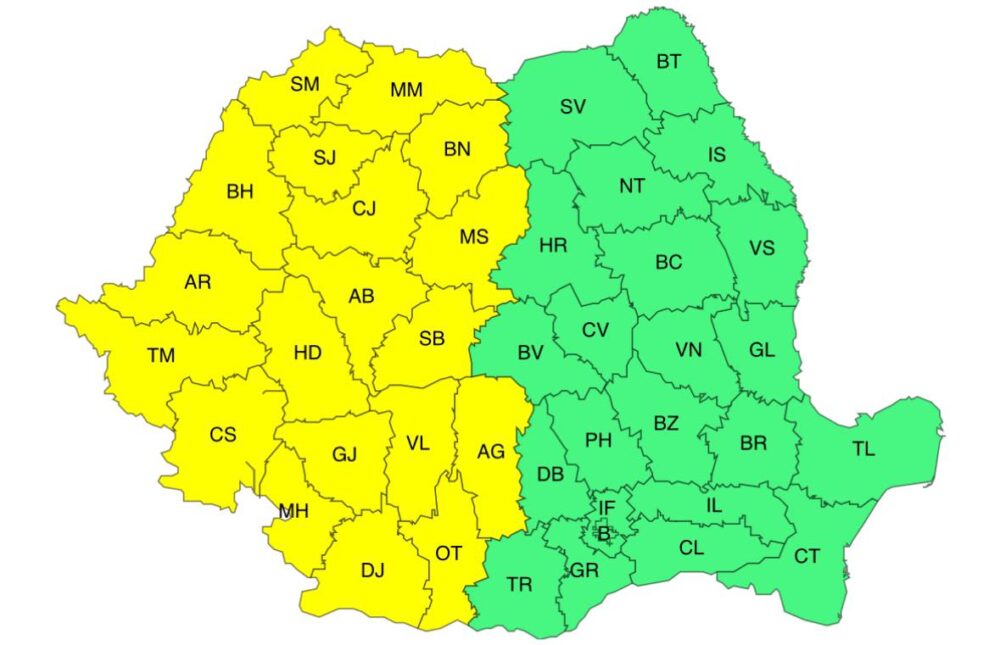ANM a amis o nouă ATENȚIONARE METEOROLOGICĂ COD GALBEN de fenomene meteo precum vânt, furtună, ploi, grindină.