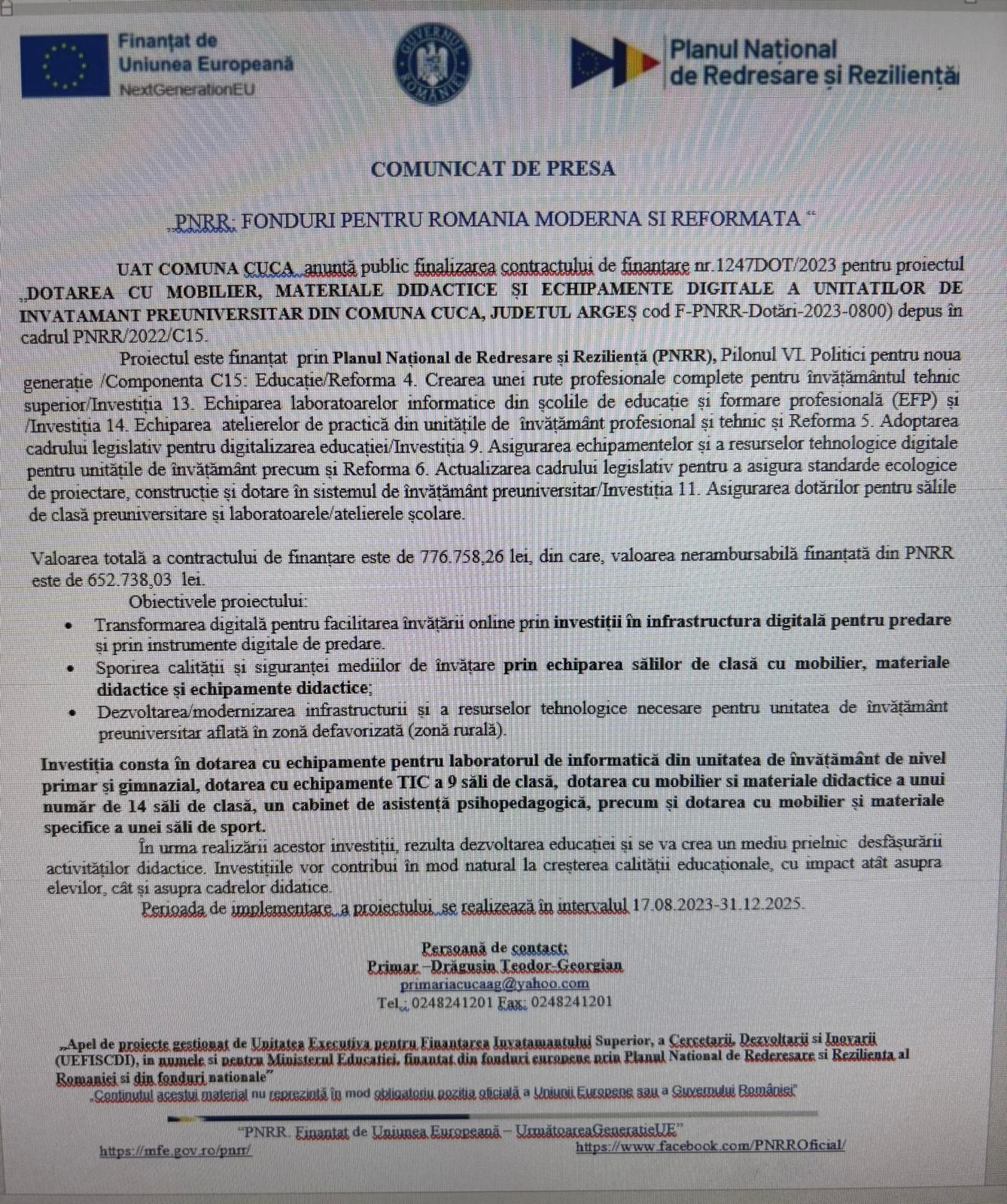 Comuna Cuca a anunțat finalizarea contractului de finanțare nr. 1247DOT/2023 pentru proiectul „Dotarea cu mobilier, materiale didactice și echipamente digitale a unităților de învățământ preuniversitar din comuna Cuca, județul Argeș”, depus în cadrul programului PNRR/2022/C15.
