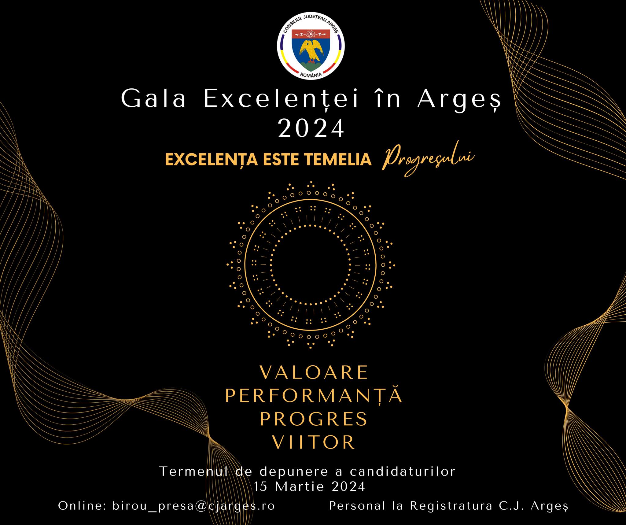 Consiliul Județean Argeș organizează ”Gala Excelenței în Argeș” – ediția 2024, eveniment dedicat personalităţilor argeșene care, prin activitatea ştiinţifică şi profesională, s-au remarcat în domenii de referință în cursul anului 2023, contribuind în mod esenţial la prestigiul județului Argeș.
