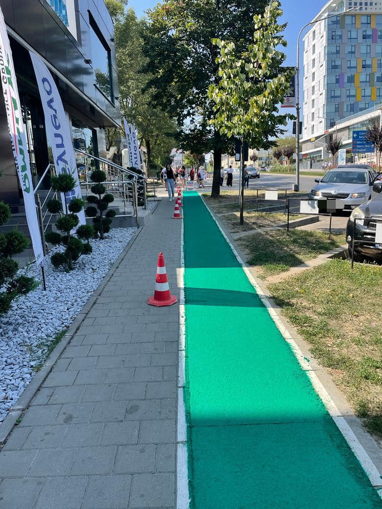 Pentru marcarea pistei de biciclete s-a utilizat vopsea bicomponentă 2k antiskid de culoare verde, aplicată la cald pe suprafața carosabilă, asigurând astfel durabilitatea și vizibilitatea în timpul utilizării.