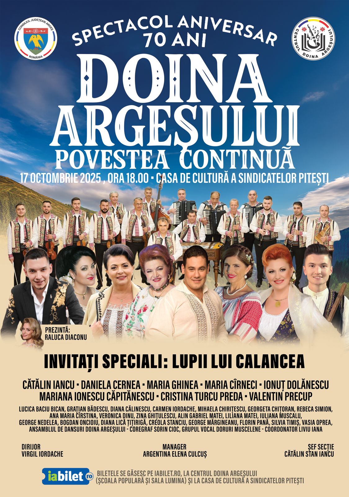 Pe 17 octombrie 2025, de la ora 18.00, la Casa de Cultură a Sindicatelor din Piteşti orchestra „Doina Argeşului” ne oferă un spectacol de neuitat alături de invitaţii săi speciali, Mariana Ionescu Căpitănescu, Ionuţ Dolănescu, Maria Cârneci, Maria Ghinea şi mulţi alţii. Atmosfera va fi întreţinută de invitaţii speciali „Lupii lui Calancea” şi va fi un spectacol aniversar de zile mari.