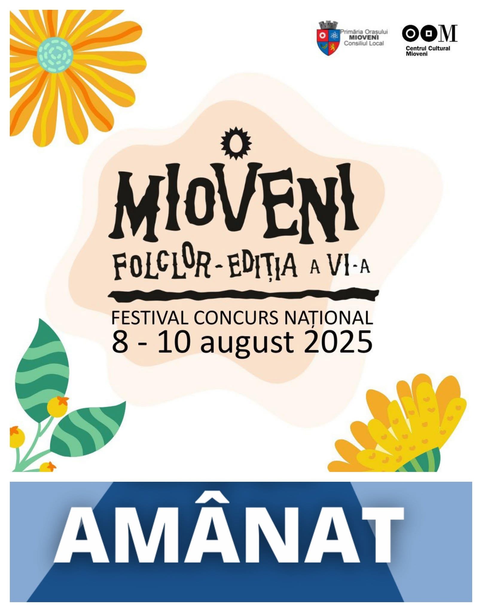 Consiliul Local, Primăria orașului și Centrul Cultural Mioveni anunță amânarea celei de-a VI-a ediții a Festivalului-Concurs Național de Folclor „Mioveni”, eveniment care urma să se desfășoare în perioada 8–10 august 2025.
