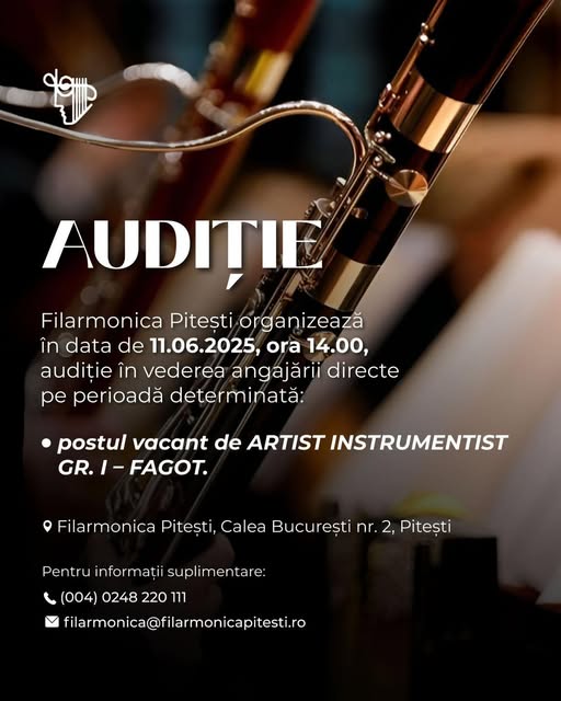 Filarmonica Pitești organizează audiție pentru postul de Artist Instrumentist – Fagot, Gr. I.