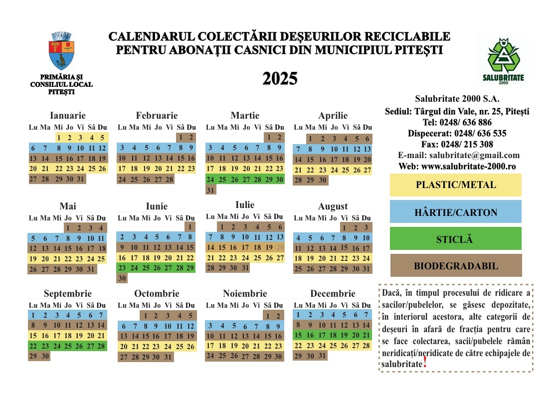 Salubritate 200 S.A. aduce în atenția abonaților casnici din Pitești graficul de colectare a deșeurilor reciclabile, pe fracții separate, pentru anul 2025, conform calendarului atașat.