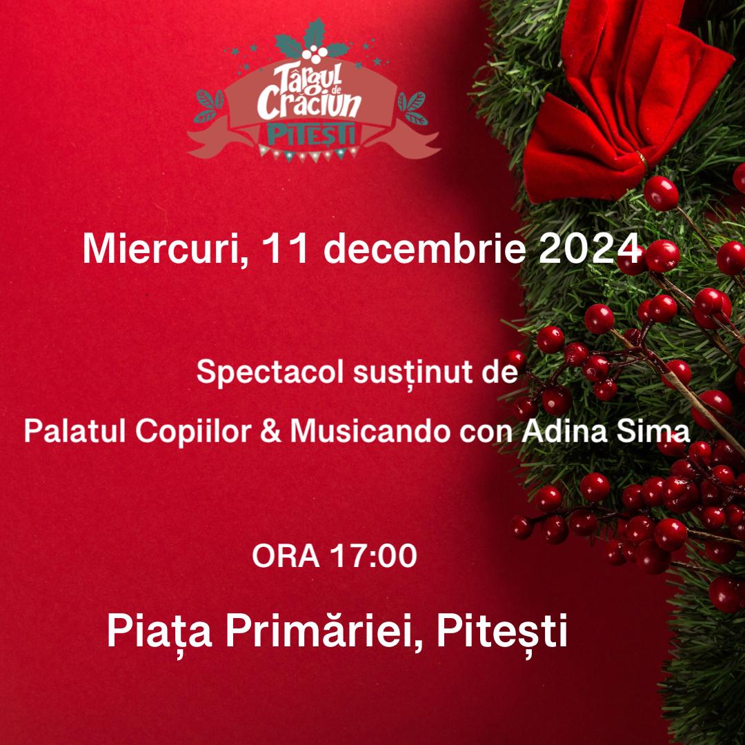 Miercuri, 11 decembrie, timp de două ore, de la 17:00 la 19:00, pasiunea pentru muzică și dans a elevilor de la Palatul Copiilor va încânta vizitatorii Târgului de Crăciun Pitești, alături de momentele muzicale speciale oferite de micii artiști formați la școala de talente „Musicando con Adina Sima”!
