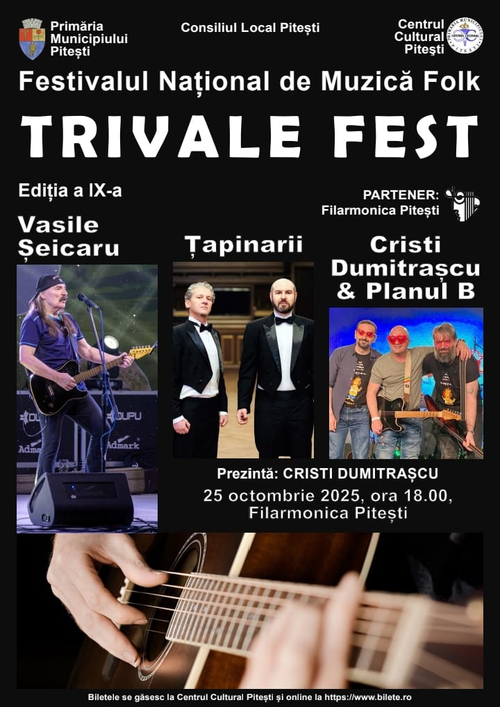 Primăria Municipiului Pitești, prin Centrul Cultural Pitești, organizează sâmbătă, 25 octombrie 2025, de la ora 18:00, în sala de concerte a Filarmonicii Pitești, cea de-a IX-a ediție a Festivalului Național de Muzică Folk TRIVALE FEST.
