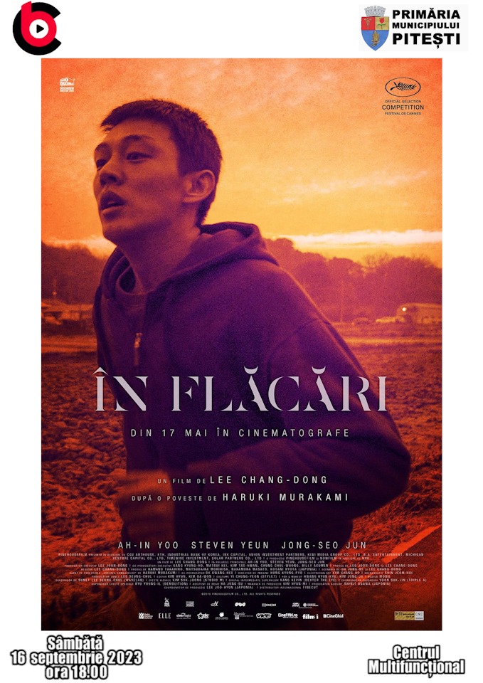 Sâmbătă, 16 septembrie 2023, de la ora 18.00, la Cinematograful de artă „București” va fi proiectat filmul „În flăcări”, regizat de Chang-dong Lee, în rolurile principale fiind Ah In Yoo, Steven Yeun și Jong-seo Jeon.
