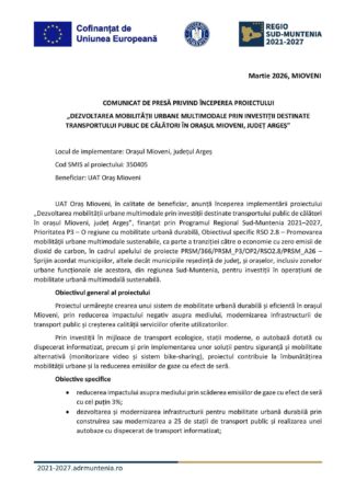 COMUNICAT DE PRESĂ PRIVIND ÎNCEPEREA PROIECTULUI „DEZVOLTAREA MOBILITĂȚII URBANE MULTIMODALE PRIN INVESTIȚII DESTINATE TRANSPORTULUI PUBLIC DE CĂLĂTORI ÎN ORAȘUL MIOVENI, JUDEȚ ARGEȘ”