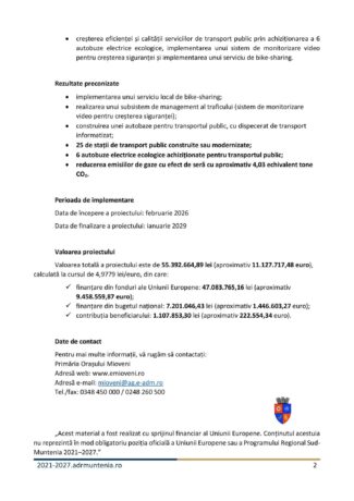 Locul de implementare: Orașul Mioveni, județul Argeș Cod SMIS al proiectului: 350405 Beneficiar: UAT Oraș Mioveni UAT Oraș Mioveni, în calitate de beneficiar, anunță începerea implementării proiectului „Dezvoltarea mobilității urbane multimodale prin investiții destinate transportului public de călători în orașul Mioveni, județ Argeș”, finanțat prin Programul Regional Sud-Muntenia 2021–2027, Prioritatea P3 – O regiune cu mobilitate urbană durabilă, Obiectivul specific RSO 2.8 – Promovarea mobilității urbane multimodale sustenabile, ca parte a tranziției către o economie cu zero emisii de dioxid de carbon, în cadrul apelului de proiecte PRSM/366/PRSM_P3/OP2/RSO2.8/PRSM_A26 – Sprijin acordat municipiilor, altele decât municipiile reședință de județ, și orașelor, inclusiv zonelor urbane funcționale ale acestora, din regiunea Sud-Muntenia, pentru investiții în operațiuni de mobilitate urbană multimodală sustenabilă. OBIECTIVUL GENERAL AL PROIECTULUI Proiectul urmărește crearea unui sistem de mobilitate urbană durabilă și eficientă în orașul Mioveni, prin reducerea impactului negativ asupra mediului, modernizarea infrastructurii de transport public și creșterea calității serviciilor oferite utilizatorilor. Prin investiții în mijloace de transport ecologice, stații moderne, o autobază dotată cu dispecerat informatizat, precum și prin implementarea unor soluții pentru siguranță și mobilitate alternativă (monitorizare video și sistem bike-sharing), proiectul contribuie la îmbunătățirea mobilității urbane și la reducerea emisiilor de gaze cu efect de seră. OBIECTIVE SPECIFICE • reducerea impactului asupra mediului prin scăderea emisiilor de gaze cu efect de seră cu cel puțin 3%; • dezvoltarea și modernizarea infrastructurii pentru mobilitate urbană durabilă prin construirea sau modernizarea a 25 de stații de transport public și realizarea unei autobaze cu dispecerat de transport informatizat; • creșterea eficienței și calității serviciilor de transport public prin achiziționarea a 6 autobuze electrice ecologice, implementarea unui sistem de monitorizare video pentru creșterea siguranței și implementarea unui serviciu de bike-sharing. REZULTATE PRECONIZATE • implementarea unui serviciu local de bike-sharing; • realizarea unui subsistem de management al traficului (sistem de monitorizare video pentru creșterea siguranței); • construirea unei autobaze pentru transportul public, cu dispecerat de transport informatizat; • 25 de stații de transport public construite sau modernizate; • 6 autobuze electrice ecologice achiziționate pentru transportul public; • reducerea emisiilor de gaze cu efect de seră cu aproximativ 4,03 echivalent tone CO₂. PERIOADA DE IMPLEMENTARE Data de începere a proiectului: februarie 2026 Data de finalizare a proiectului: ianuarie 2029 VALOAREA PROIECTULUI Valoarea totală a proiectului este de 55.392.664,89 lei (aproximativ 11.127.717,48 euro), calculată la cursul de 4,9779 lei/euro, din care: ✓ finanțare din fonduri ale Uniunii Europene: 47.083.765,16 lei (aproximativ 9.458.559,87 euro); ✓ finanțare din bugetul național: 7.201.046,43 lei (aproximativ 1.446.603,27 euro); ✓ contribuția beneficiarului: 1.107.853,30 lei (aproximativ 222.554,34 euro). Date de contact Pentru mai multe informații, vă rugăm să contactați: Primăria Orașului Mioveni Adresă web: www.emioveni.ro Adresă e-mail: mioveni@ag.e-adm.ro Tel./fax: 0348 450 000 / 0248 260 500 „Acest material a fost realizat cu sprijinul financiar al Uniunii Europene. Conținutul acestuia nu reprezintă în mod obligatoriu poziția oficială a Uniunii Europene sau a Programului Regional Sud-Muntenia 2021–2027.”