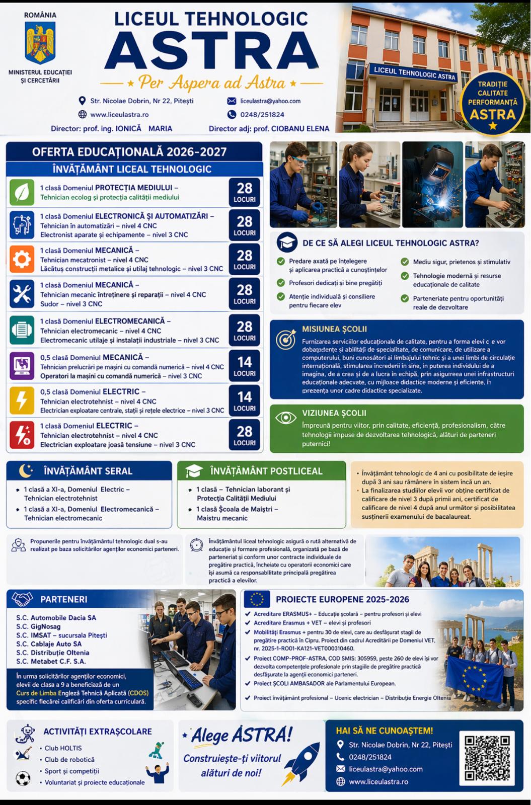 În peisajul educațional al județului Argeș, Liceul Tehnologic ASTRA din Pitești se distinge ca o instituție de referință, în care tradiția se îmbină armonios cu inovația, iar educația capătă o dimensiune practică, adaptată realităților contemporane. Cu o experiență solidă în formarea profesională a tinerilor, ASTRA reprezintă un spațiu al dezvoltării autentice, în care fiecare elev este sprijinit să își descopere vocația și să își construiască un parcurs sigur.