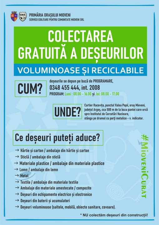 Locuitorii orașului Mioveni pot depune GRATUIT deșeuri voluminoase, textile sau DEEE la punctul de colectare din Racovița, str. Piscul Ilinii, oraș Mioveni, la cca 500 m de la baza pantei care urcă spre Institutul de Cercetări Nucleare – zona fosta Rampă de gunoi.