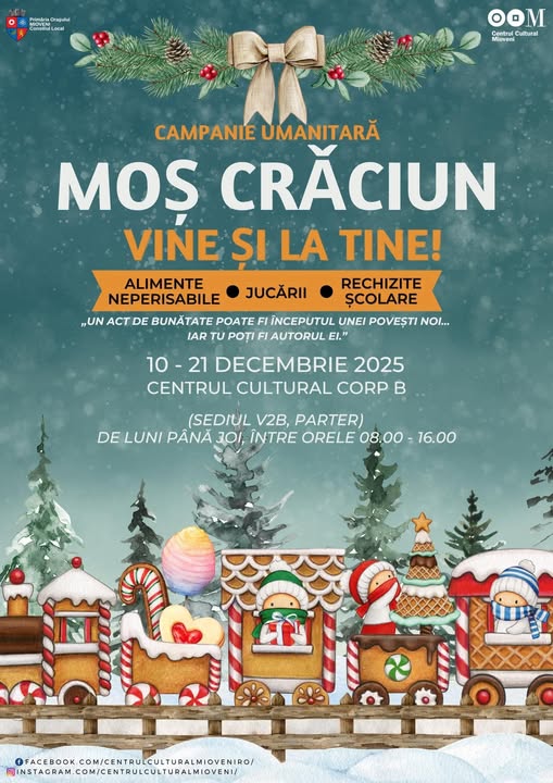 În perioada 10 – 21 decembrie 2025, Primăria orașului Mioveni, Consiliul Local Mioveni și Centrul Cultural Mioveni organizează campania umanitară „Moș Crăciun vine și la tine!”, dedicată sprijinirii copiilor și familiilor aflate în dificultate.