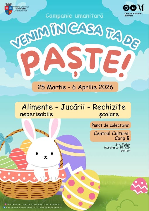Consiliul Local Mioveni, Primăria orașului Mioveni și Centrul Cultural Mioveni organizează, în perioada 25 martie – 6 aprilie 2026, tradiționala campanie umanitară „Venim în casa ta de Paște”, dedicată sprijinirii familiilor aflate în dificultate.