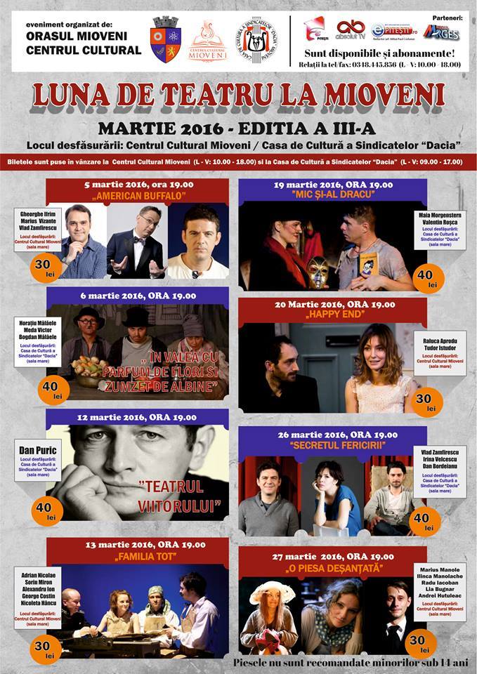 În luna martie va bate gongul pentru “Festivalul de Teatru Mioveni”, manifestarea aflată la a treia ediţie fiind organizată de Primăria Mioveni, Centrul Cultural şi Casa de Cultură a Sindicatelor „Dacia”, în perioada 5-27 martie.