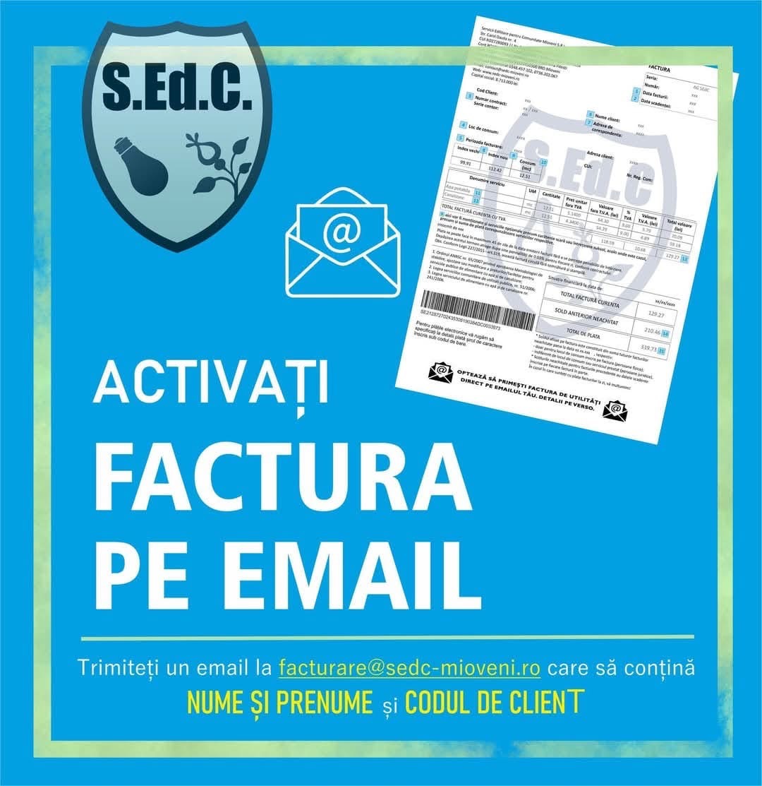 Tot ce trebuie să faceți este să trimiteți un email la adresa 𝗳𝗮𝗰𝘁𝘂𝗿𝗮𝗿𝗲@𝘀𝗲𝗱𝗰-𝗺𝗶𝗼𝘃𝗲𝗻𝗶.𝗿𝗼, care sa conțină: 𝗡𝗨𝗠𝗘, 𝗣𝗥𝗘𝗡𝗨𝗠𝗘, 𝗖𝗢𝗗𝗨𝗟 𝗗𝗘 𝗖𝗟𝗜𝗘𝗡𝗧 precum și locul de consum pentru care doriți să primiți factura în format electronic.