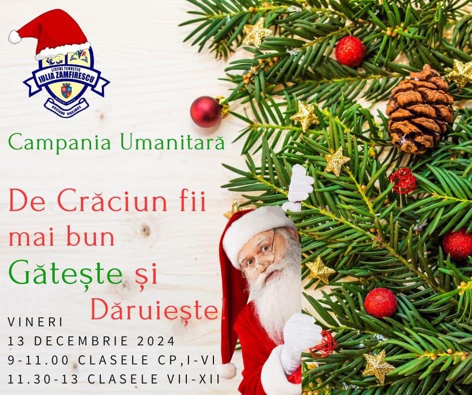 În cadrul campaniei umanitare „De Crăciun fii mai bun: Gătește și dăruiește”, care va avea loc în sala de sport a liceului, între orele 09:00-13:00, vizitatorii vor putea achiziționa dulciuri de casă, decorațiuni festive și obiecte de artizanat, toate realizate cu dragoste și talent.