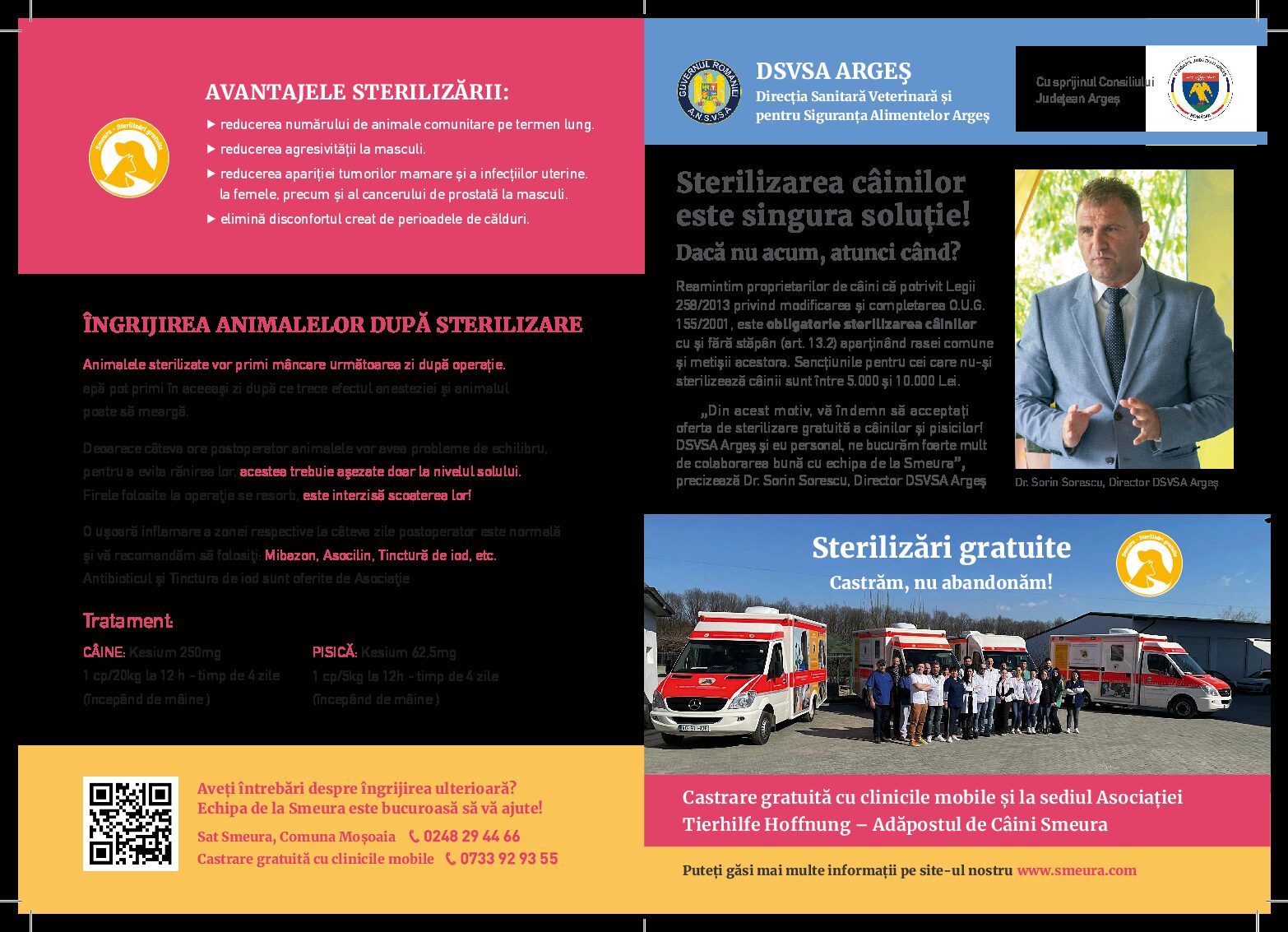 Asociaţia Tierhilfe Hoffnung, cea pe care o cunosc toţi argeşenii ca Smeura, face de ani buni eforturi uriaşe pentru ca abandonul să fie eliminat prin sterilizări gratuite. Alături de aceşti oameni de la asociaţie s-au aşezat şi autorităţi publice, Direcţia Sanitar Veterinară sau primăriile care au înţeles importanţa uriaşă a acestor acţiuni. Haideţi să punem şi noi umărul, căci toate sterilizările sunt o binefacere şi pentru animăluţe şi pentru noi, comunitatea. Cu un gest minim din partea noastră şi cu o implicare uriaşă a oamenilor de la Asociaţia Tierhilfe Hoffnung, viaţa poate fi mai bune şi pentru noi şi pentru prietenii noştri în patru lăbuţe. Se fac sterilizări gratuite şi în clinicile mobile ale asociaţiei şi la sediul asociaţiei, aflat în satul Smeura, comuna Moşoaia . Tot ce trebuie să faci e să suni la 0733 92 93 55 pentru a programa catelul sau pisica în clinicile mobile sau la 0248 29 44 66 pentru sterilizări la sediul asociaţiei. Totul este gratuit. Doar bunăvoinţă şi un strop de civilizaţie ne trebuie. Puteţi face programări şi pe www.smeura.com. Haideţi să întândem mâna celor care ne-au întins ambele braţe pentru a evita suferinţa unor animăluţe care nu au nicio vină că s-au născut în locuri în care civilizaţia lasă de dorit. Nu îi abandonaţi, nu le faceţi rău, nu-i condamnaţi la moarte ! Este ilegal şi total imoral! Sterlizaţi! E gratuit şi e un semn de civilizaţie şi umanitate ! Sterilizati gratuit prin Asociaţia Tierhilfe Hoffnung sau Smeura, aşa cum o ştim cu toţii!