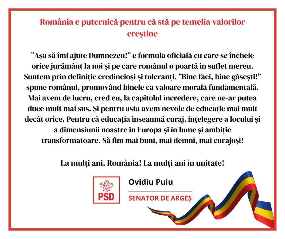 Ovidiu Puiu, senator PSD Argeș: La mulți ani, România! La mulți ani în unitate!