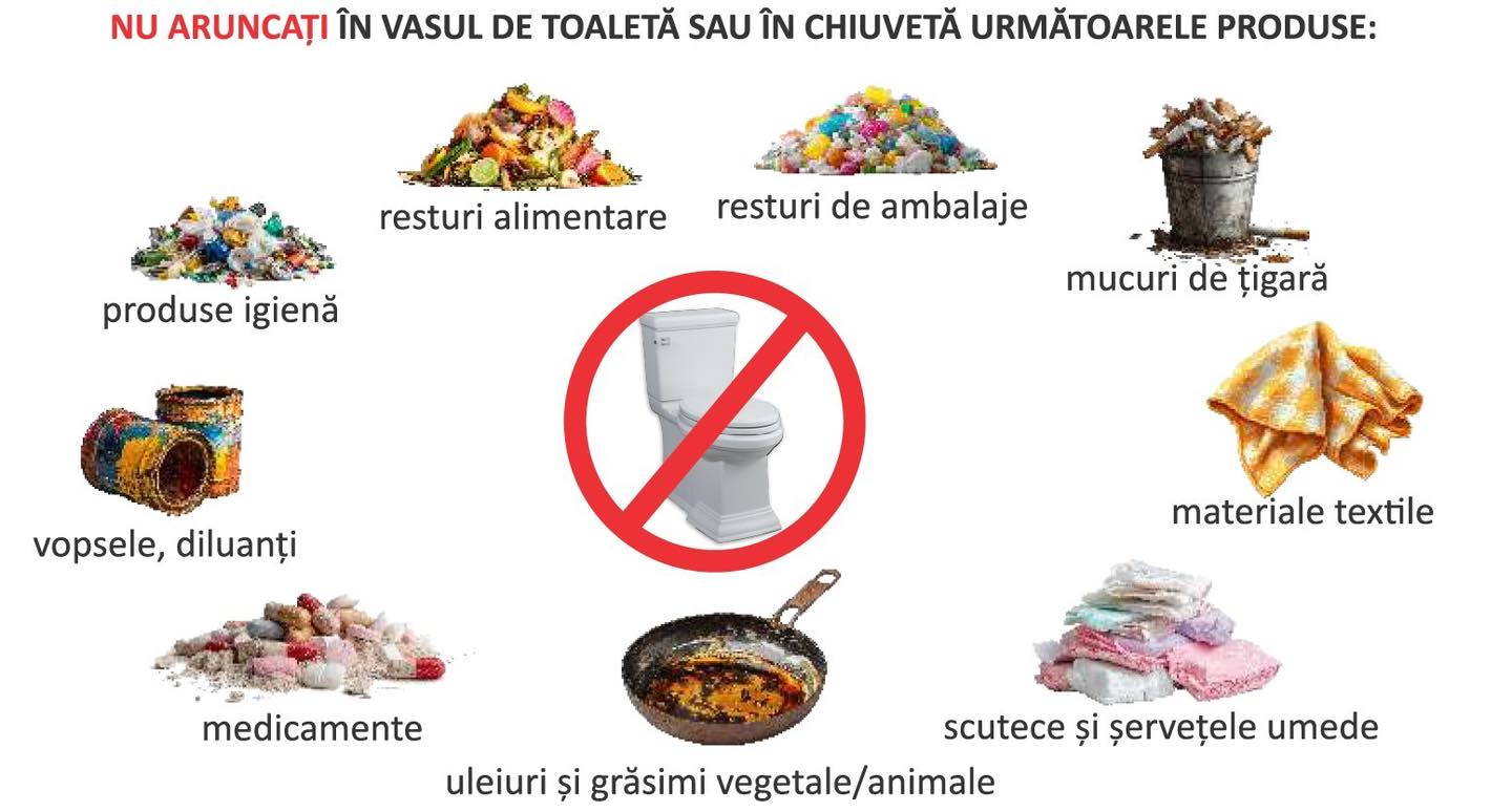 ”Nu aruncaţi în vasul de toaletă sau în chiuvetă următoarele produse: resturi alimentare, produse de igienă (șervețele umede, tampoane, beţişoare ureche), scutece, resturi de ambalaje, materiale textile, materiale de construcţii (vopsele, diluanţi, moloz), medicamente, mucuri de ţigară, uleiuri şi grăsimi vegetale/animale, alte deşeuri.