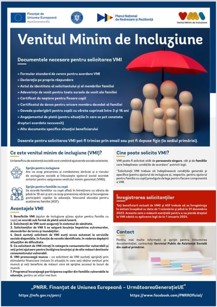 Începând cu 1 ianuarie 2024 va fi aplicată Legea nr.196/2016, privind venitul minim de incluziune, cu modificările și completările ulterioare, lege care face parte din Programul Național de Redresare și Reziliență (PNNR), capitolul 13, „Reforme Speciale”.