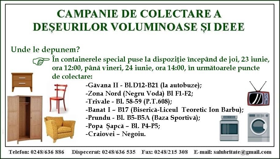 Locuitorii municipiului Pitești pot depune deșeurile voluminoase, precum și deșeurile de echipamente electrice și electronice (DEEE) în containerele special puse la dispoziție începând de joi, 23 iunie, ora 12:00, până vineri, 24 iunie, ora 14:00, în următoarele puncte de colectare:
