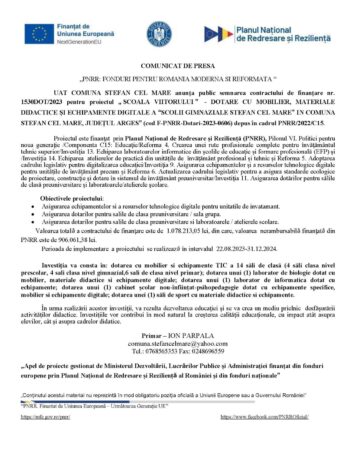 „Școala viitorului” – Dotare cu mobilier, materiale didactice și echipamente digitale a Școlii Gimnaziale Ștefan cel Mare, în comuna Ștefan cel Mare, jud. Argeș (cod F-PNRR-Dotari-2023-0606) depus în cadrul PNRR/2022/C15.