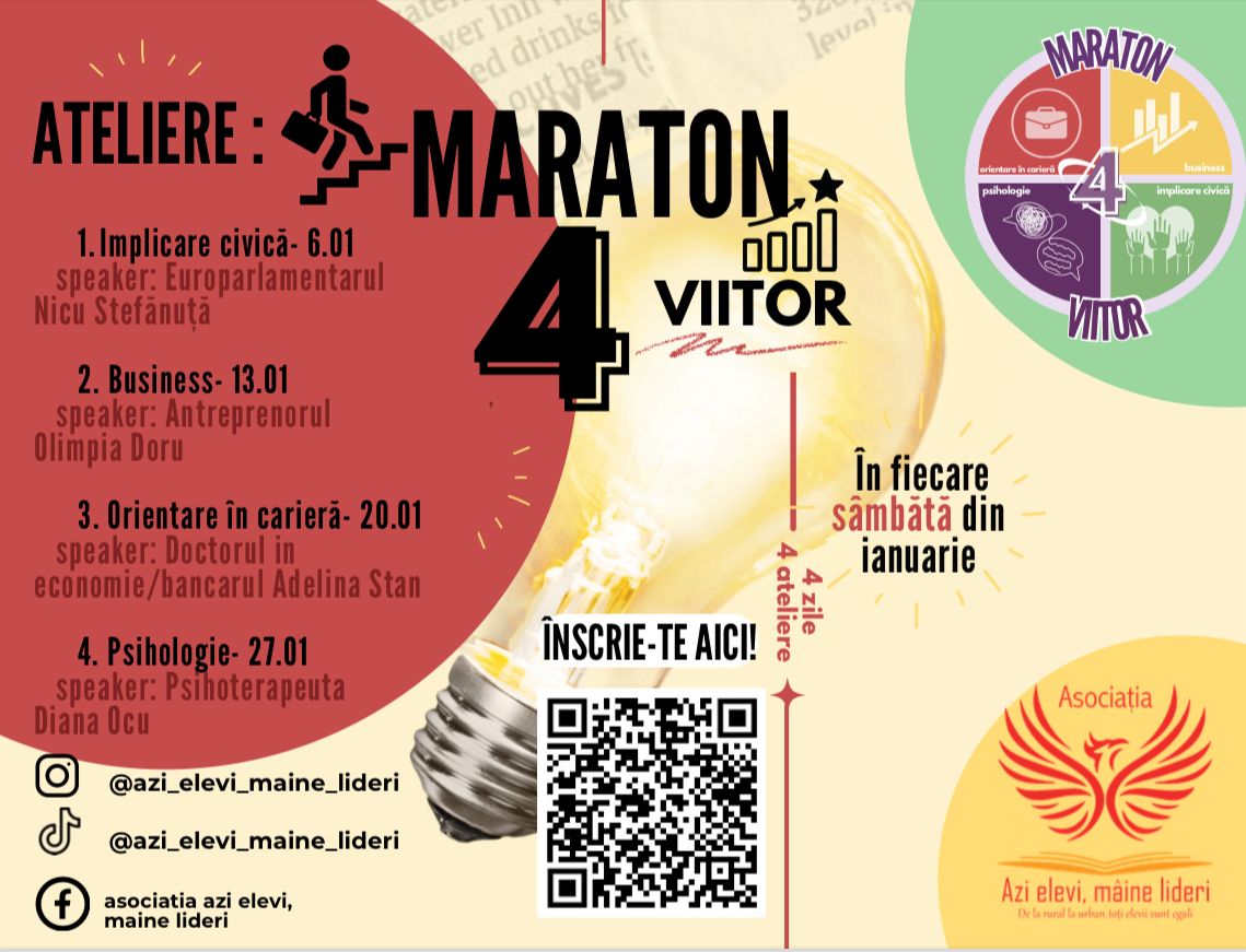 De asemenea, în cadrul proiectului, în perioada lunii ianuarie 2024, este proiectată activitatea „Maraton 4 viitor” – patru ateliere, susținute în fiecare sâmbătă din luna ianuarie, în care vor fi abordate tematicile: Implicare civică, Business, Orientare în carieră și Psihologie, de către specialiști în fiecare domeniu. Tinerii argeșeni sunt așteptați, în număr cât mai mare, să participe la aceste ateliere, înscrierea făcându-se prin accesarea aceluiași link: https://linktr.ee/azielevimainelideri…