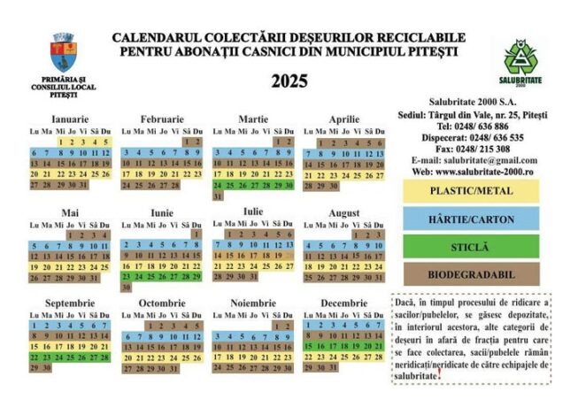 Salubritate 2000 S.A. reamintește tuturor abonaților din Pitești că deșeurile reciclabile vor fi colectate pe fracții separate, conform calendarului atașat.