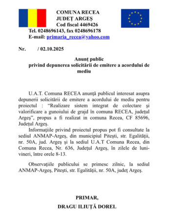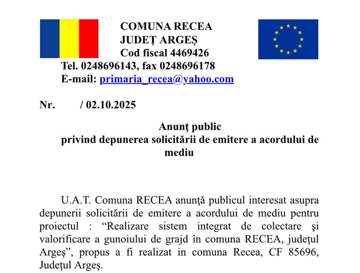 U.A.T. Comuna RECEA anunţă publicul interesat asupra depunerii solicitării de emitere a acordului de mediu pentru proiectul : “Realizare sistem integrat de colectare şi valorificare a gunoiului de grajd în comuna RECEA, judeţul Argeş”, propus a fi realizat in comuna Recea, CF 85696, Judeţul Argeş.