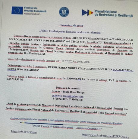 Comuna Recea anunță începerea proiectului cu titlul „REABILITAREA MODERATA A CLADIRII SCOLII DIN LOCALITATEA RECEA JUDETUL ARGES”, cod C10-I3-3183, Investiția I.3 – Reabilitarea moderată a clădirilor publice pentru a îmbunătăți serviciile publice prestate la nivelul unităților administrativ-teritoriale, implementat de Comuna Recea, judetul Arges conform contractului de finanțare nr. 17444/10.02.2023, finanțat prin Planul National pentru Redresare si Rezilienta al Romaniei in cadrul componentei 10 – Fondul Local.
