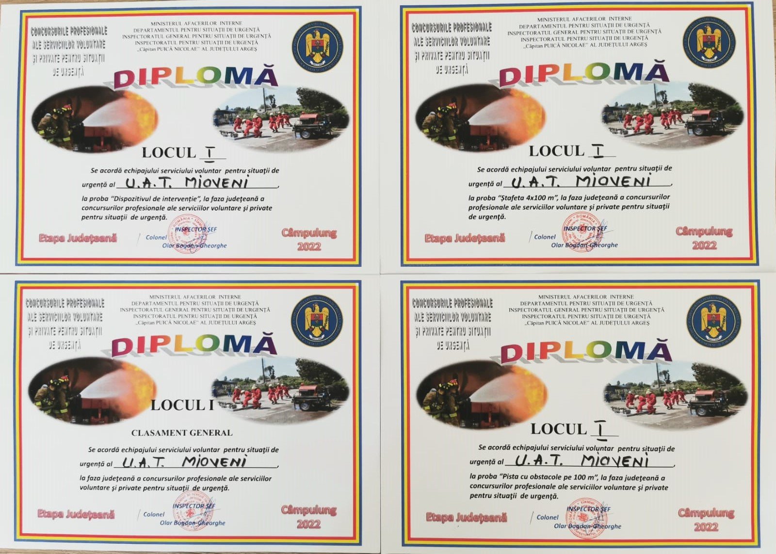 Echipajul Serviciului Voluntar pentru Situații de Urgență al orașului Mioveni a câștigat faza județeană a concursurilor profesionale ale serviciilor voluntare și private pentru situații de urgență, competiție organizată de ISU Argeș.