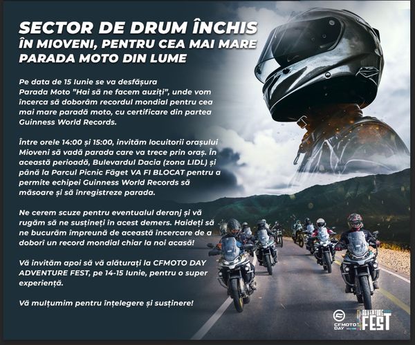 În acest timp, sectorul de drum Bulevardul Dacia (zona LIDL) – Zona de Picnic FĂGET va fi ÎNCHIS, pentru a permite echipei GUINNESS WORLD RECORDS să măsoare și să înregistreze parada.