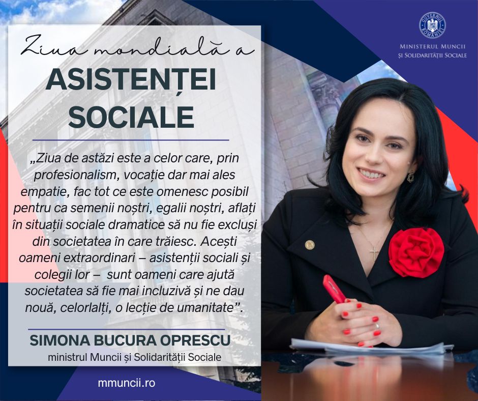 „Ziua de astăzi este a celor care, prin profesionalism, vocație dar mai ales empatie, fac tot ce este omenesc posibil pentru ca semenii noștri, egalii noștri, aflați în situații sociale dramatice să nu fie excluși din societatea în care trăiesc. În fiecare a treia zi de marți din luna martie sărbătorim Ziua Mondiala a Asistentei Sociale, zi in care ar trebui sa reflectam pentru un moment dacă ajutăm cu adevărat oamenii aflați în nevoie, dacă reușim să le fim alături în momente dramatice. Astăzi îi cinstim pe toți profesioniștii care îi sprijină neobosit, care au capacitatea să le fie alături în depășirea momentelor de criză. Acești oameni extraordinari – asistenții sociali și colegii lor – sunt oameni care ajută societatea să fie mai incluzivă și ne dau nouă, celorlalți, o lecție de umanitate. Prin reforma pe care am inițiat-o ne propunem să întărim rolul asistenților sociali”, a declarat Simona Bucura-Oprescu, ministrul Muncii și Solidarității Sociale”.